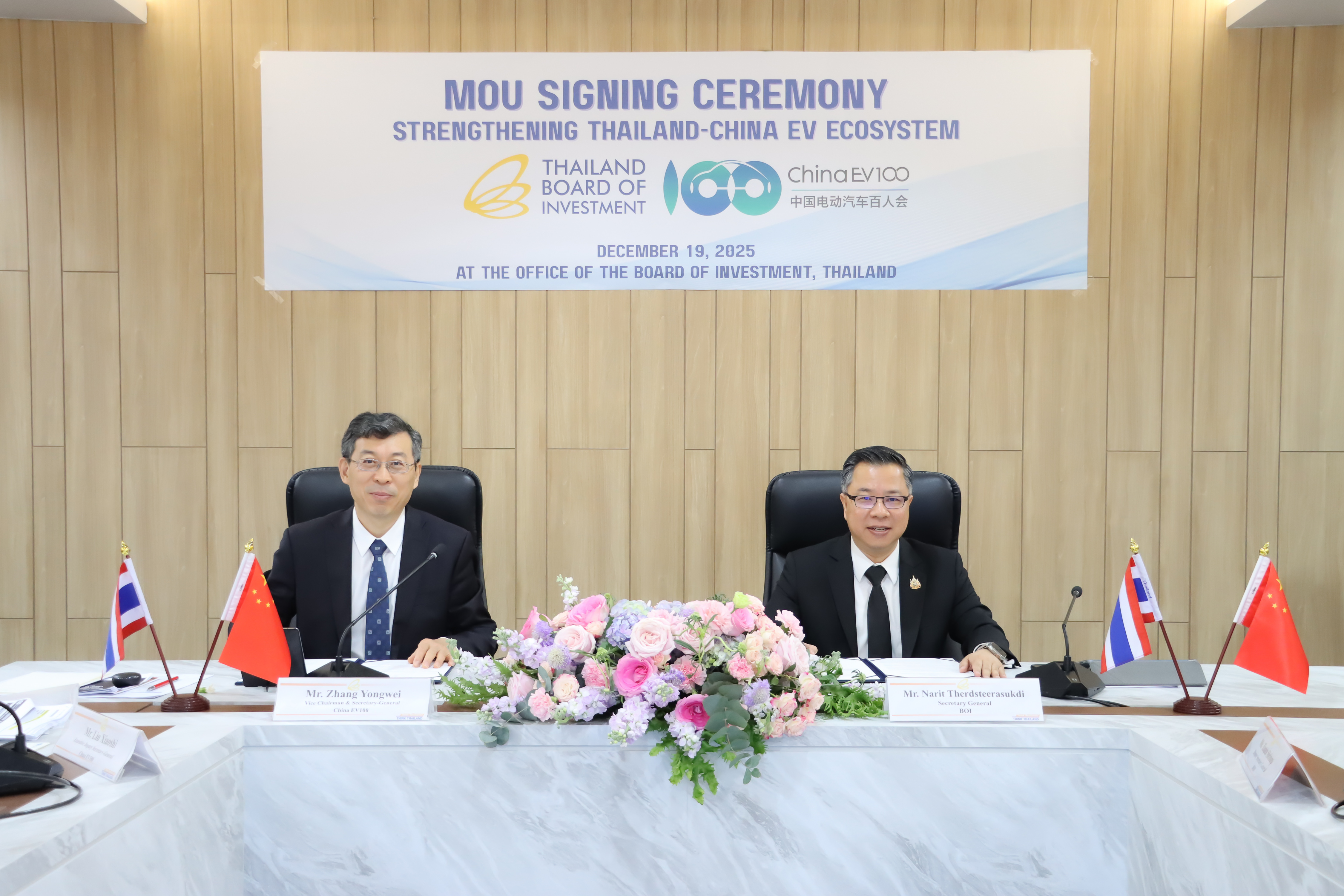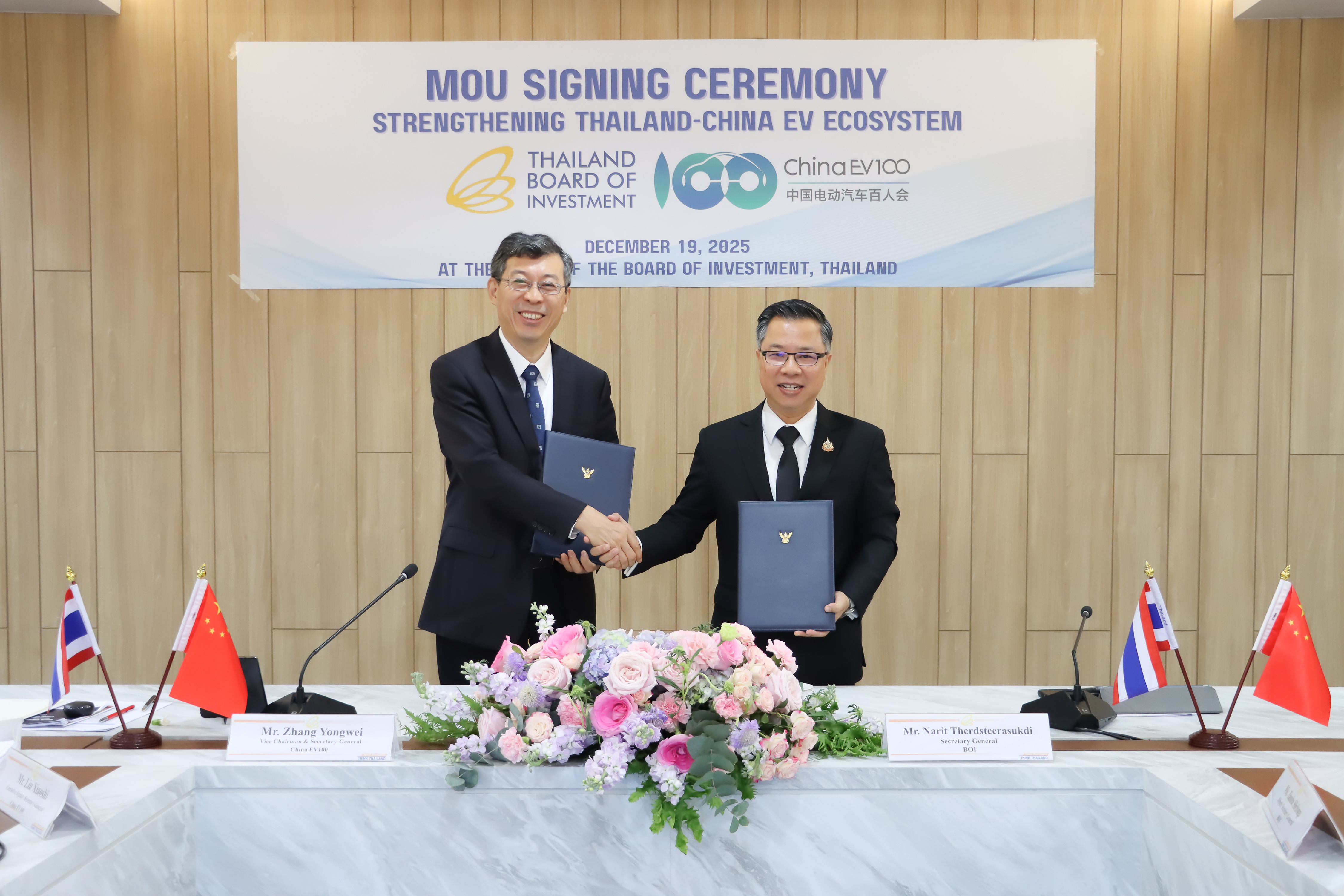 12月19日,车百会研究院联合泰国投资促进委员会(BOI)在泰国曼谷BOI总部办公室举行谅解备忘录(MoU)签署仪式。泰国投资促进委员会秘书长纳立·特萨提拉沙(Narit Therdsteerasukdi)、车百会理事长张永伟出席活动并签署MoU。