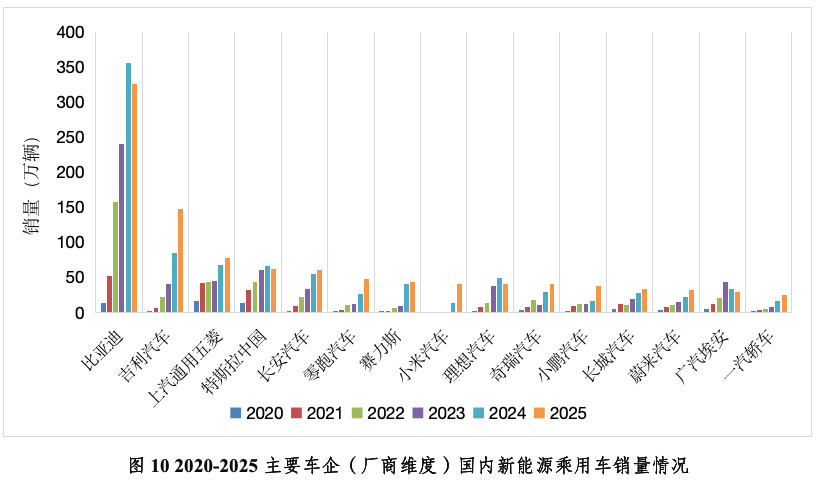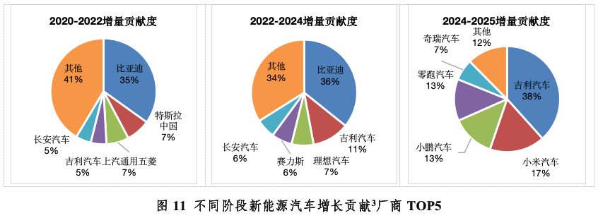 自主与新势力车企交替拉动新能源市场增长。2025年国内新能源乘用车渗透率达到54%,新能源汽车正式成为市场消费主流。不同发展阶段,车企对市场增长的贡献度呈现明显轮动特征。2020-2022年,新能源乘用车增长动力主要来自比亚迪、特斯拉与上汽通用五菱。比亚迪凭借全产业链布局与多车型覆盖抢占市场份额,特斯拉依托品牌与技术优势巩固高端市场地位,五菱则以高性价比车型精准撬动下沉市场需求。2022-2024年,比亚迪增长势头依旧强劲,与此同时,吉利、赛力斯、理想迎来高速增长期。吉利通过多品牌新能源矩阵拓宽受众群体,赛力斯凭借跨界模式实现销量跃升,理想则以增程式路线精准切中家庭用户痛点。进入2024-2025年,市场增长接力棒再次传递,吉利汽车新能源销量增长超60万辆,小米、小鹏、零跑等品牌增长均超20万辆,成为拉动市场增长的新生力量。