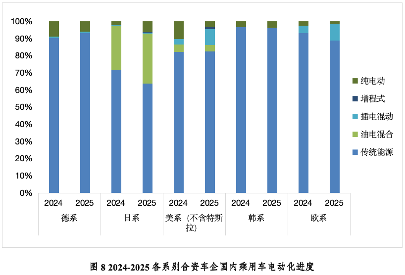 合资品牌的电动化转型进程亟待加快。从市场表现来看,合资品牌燃油车销量持续萎缩,电动化转型步伐缓慢。建议合资品牌加速本土化研发进程,结合中国市场的消费特点,推出真正具备竞争力的新能源车型。同时强化与本土供应链企业的合作,提升新能源产品的性价比与市场适配性。