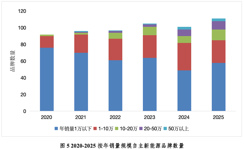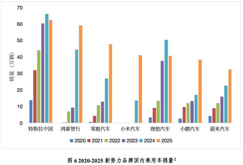 新势力阵营经历深度洗牌。从2020-2025年新势力销量走势来看,行业格局呈现出“淘汰一批、突围一批”的鲜明分化态势。年销量破万的自主新能源品牌数量由2020年的16家,增加到53家。鸿蒙智行、特斯拉、理想、小鹏、蔚来、零跑、小米等品牌凭借技术创新、产品迭代与精准的市场布局实现突围。而哪吒、威马等企业因产品缺乏核心竞争力、市场定位模糊等问题,逐步退出市场竞争。