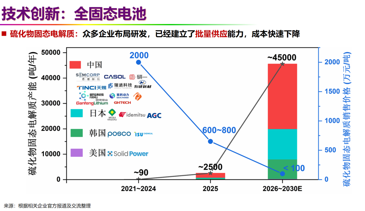 此外,硫化物固态电解质成本正急剧下降。随着中国产能快速提升,成本从过去的2000万元/吨,已降至低于100万元/吨。