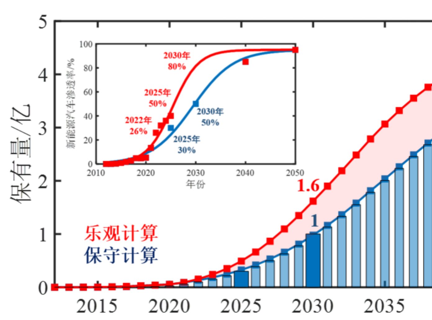 我们做了两种假设,一种是保守的,一种是激进的。保守估计,如果2025年市占率达到30%,到2030年保有量也将达到1亿辆(这是2025年前做的预测)。如果2025年市占率达到50%,2030年保有量将达到1.6亿辆,会有大幅上升。