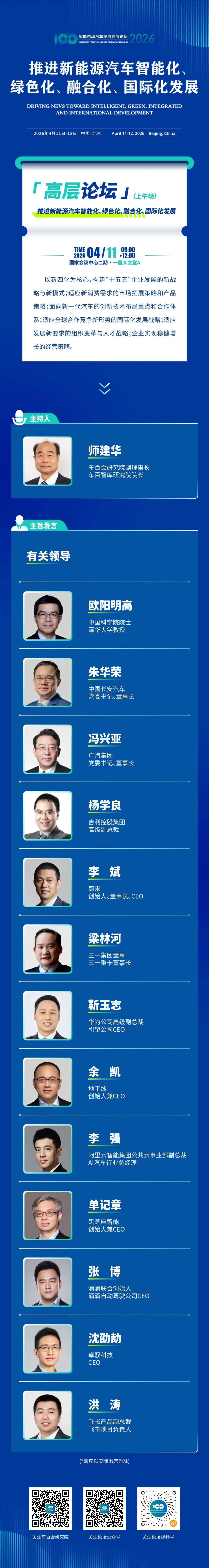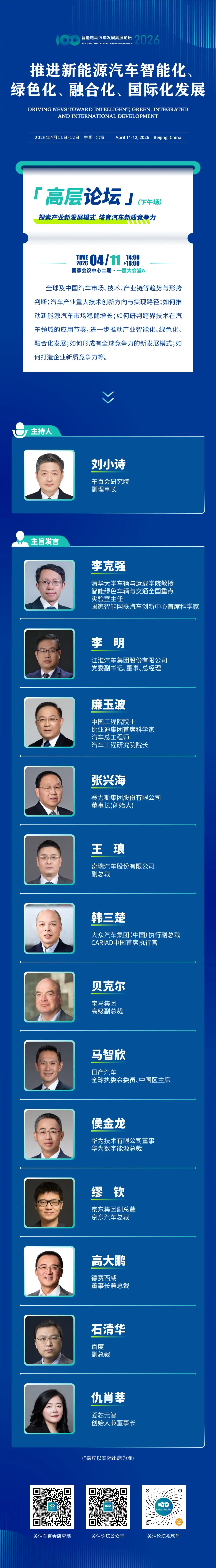 4月11日-12日,智能电动汽车发展高层论坛(2026)将在北京国家会议中心二期召开。论坛以“推进新能源汽车智能化、绿色化、融合化、国际化发展”为主题,届时举办1场高层论坛,1场国际论坛和8场主题论坛,包括Al+汽车论坛、市场与消费论坛、新能源汽车智能动力系统创新论坛、第六届车路城融合发展论坛、汽车设计论坛、智能汽车论坛、商用车可持续发展论坛、汽车“三新”前沿科技论坛。