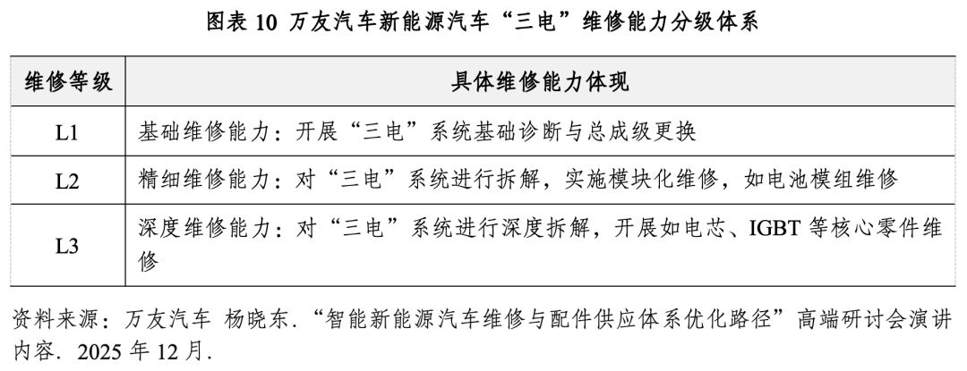 整车企业正持续强化关键零部件维修能力的建设。如问界汽车在新能源维修体系中配备了200余项通用工具和接近50项专用工具,并设置了高压机电维修、铝合金车身维修、电池储存等专用功能区,系统提升新能源汽车维修的安全性与规范性。长安汽车旗下的万友汽车构建了L1-L3三级“三电”维修能力体系,覆盖了从基础诊断与总成更换到模块化精修及深度拆解维修不同层级的需求。
