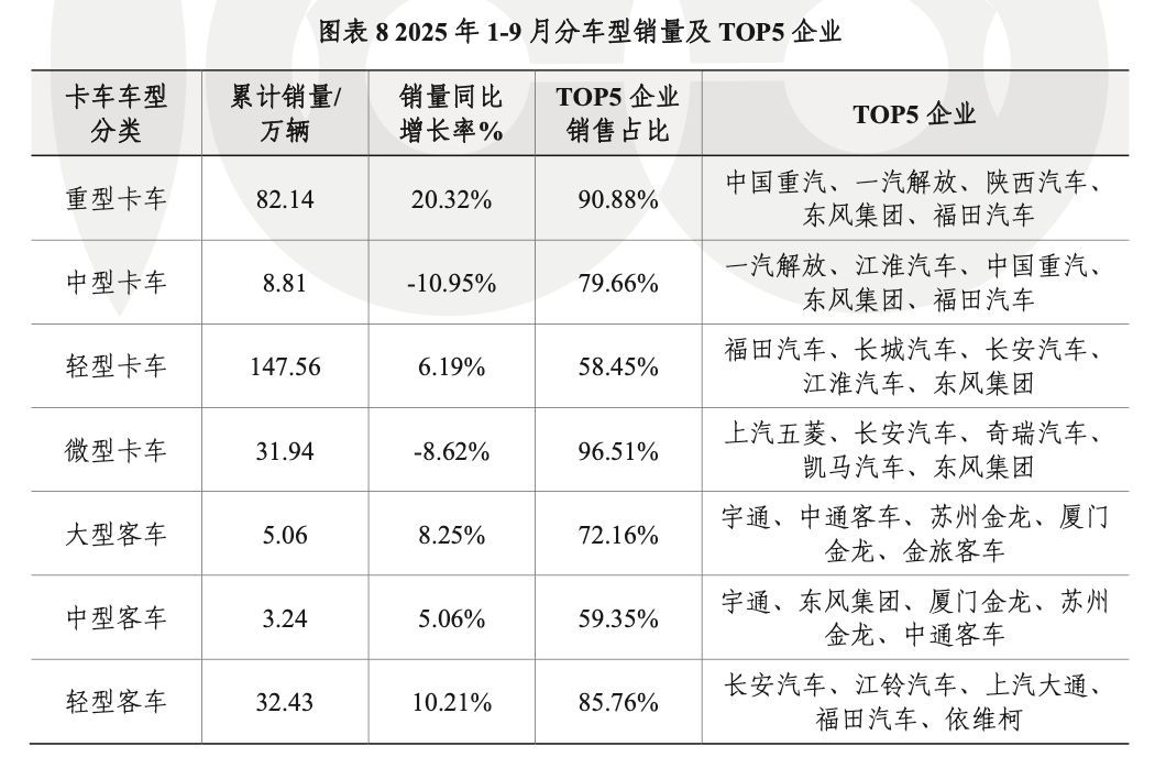 商用车企业聚焦的不同细分市场竞争激烈。2025年1-9月,商用车销量累计前十的企业8增2降。其中,卡车和客车各车型细分市场企业销量排名各异,头部企业市占率较高。