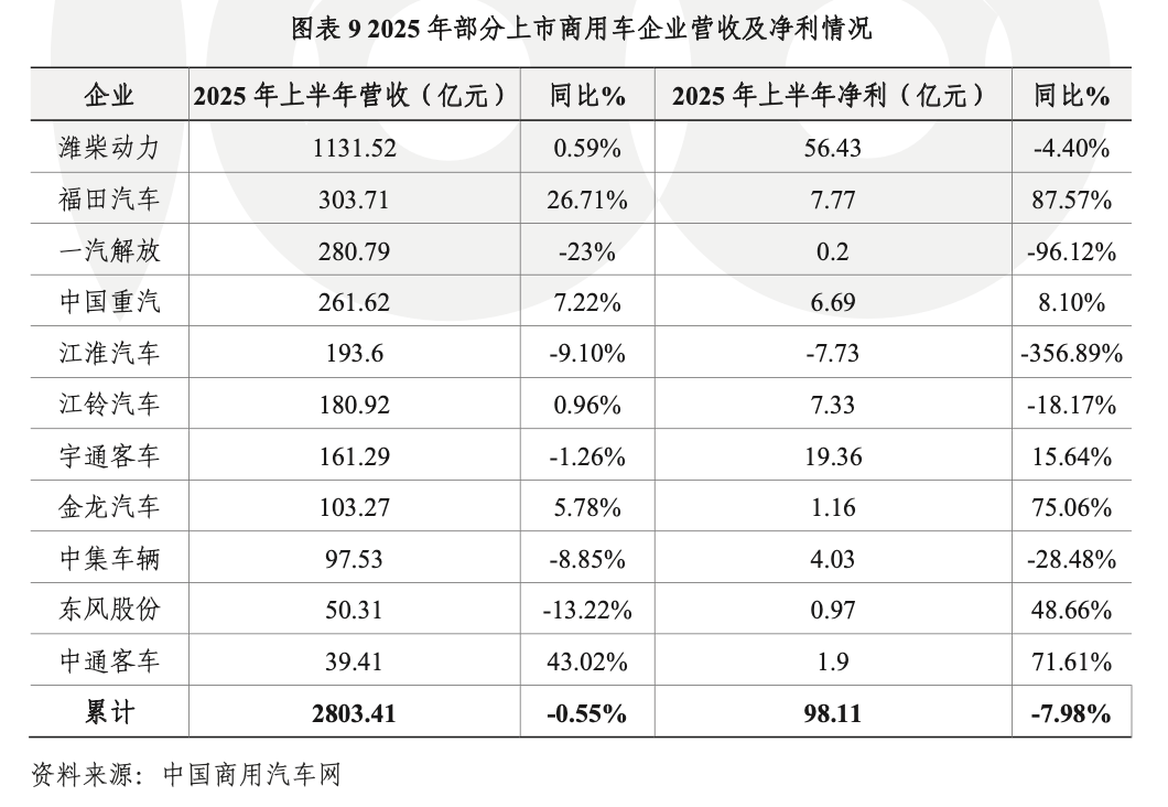 企业收益不佳,产业链盈利困难。企业普遍“增量不增利”,新能源车业务虽销量增长但亏损严重。2025年上半年,上市商用车企业的业绩分化明显,行业处在低利润率水平状态。降本压力传导至上下游,从整车蔓延至零部件、充换电基础设施等全产业链。“以价换量”的推广模式正在侵蚀整个行业的盈利能力,不利于行业健康发展。